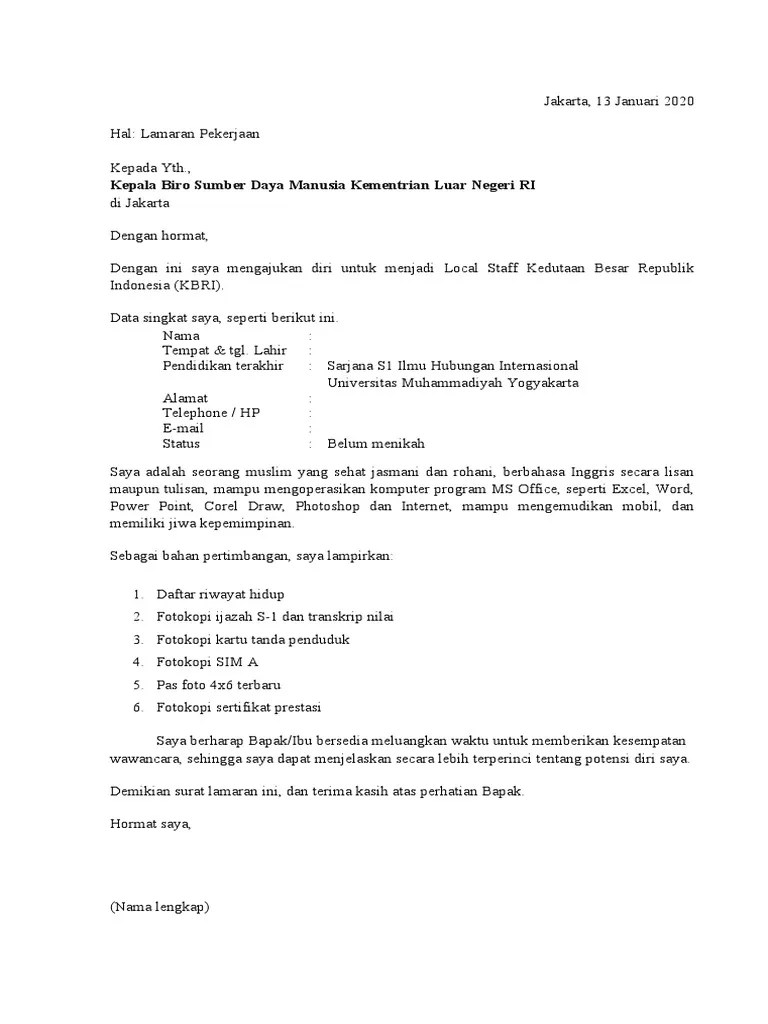 Dewasa ini, keahlian berbahasa inggris semakin dikampanyekan dalam dunia profesional. Persyaratan dalam registrasi pengajuan dan pengantar menjadi calon tenaga kerja ke luar negeri. Maka dari itu saya akan memberikan beberapa contoh surat lamaran kerja yang. Abroad = di luar negeri; Surat pengantar ketua rt mengetahui ketua rw . Dan kemudian ada juga pengalaman ketika magang, kerja paruh waktu, pelatihan industri dan sebagainya. Memiliki kemampuan berbahasa inggris yang baik secara pasif dan . Ketahui dokumen yang dibutuhkan saat melamar . Surat penyetaraan ijazah dan transkrip nilai luar negeri; . Great = sangat memuaskan, penting; Dengan ini menyampaikan surat lamaran agar dapat mengikuti seleksi penerimaan calon pegawai. Intip contoh surat lamaran kerja dalam bahasa inggris di sini. Jadi bagaimana bisa sepucuk surat pengantar begitu .